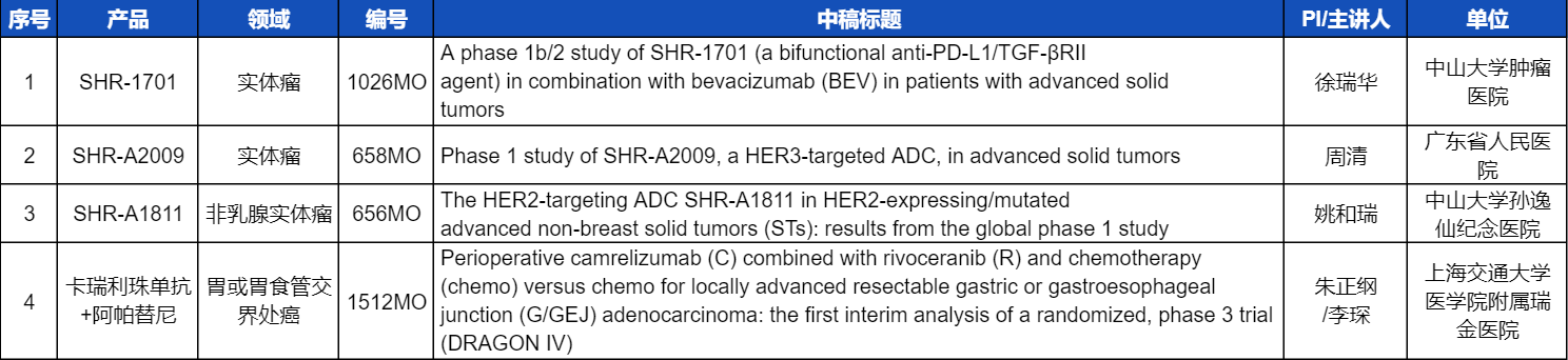 本次ESMO大会,将由中山大学肿瘤医院徐瑞华教授、广东省人民医院周清教授、中山大学孙逸仙纪念医院姚和瑞教授、上海交通大学医学院附属瑞金医院李琛教授分别就4项永利娱乐城医药创新产品相关研究做口头报告,包括SHR-1701、SHR-A2009、SHR-A1811这3款未上市创新产品的实体瘤治疗临床研究,以及1项“双艾”组合(卡瑞利珠单抗联合阿帕替尼)治疗局部晚期可切除胃/胃食管交界处癌的Ⅲ期临床试验期中分析。